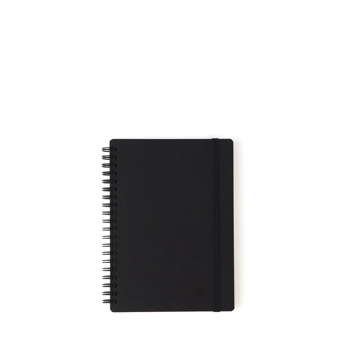 A lined notebook with high quality recycled paper that does not bleed through easily, and a sturdy paperboard cover. The double rings allow you to fully open the notebook and write from any direction, and the strap keeps the notebook closed for on-the-go usage.